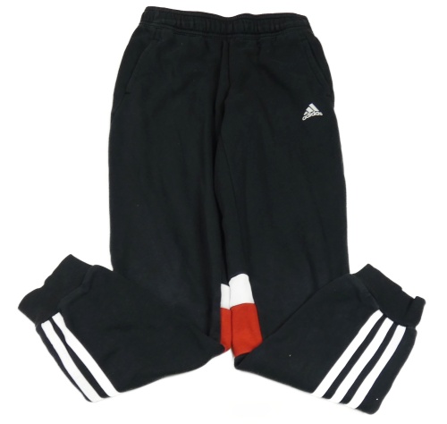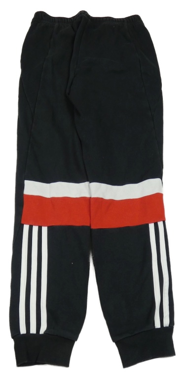 Čierne tepláky s bílými a červenymi pruhmi a logom Adidas