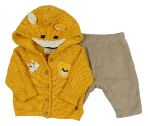 2 set - Žltý prepínaci sveter s medvěďom a kapucí + béžové zamatové tepláky