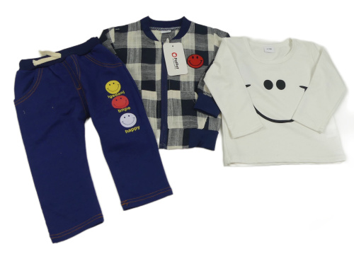 Nové - 3 set - tmavomodré tepláky so smajlíky + biele triko + tmavomdro-smotanová kockovaná mikina