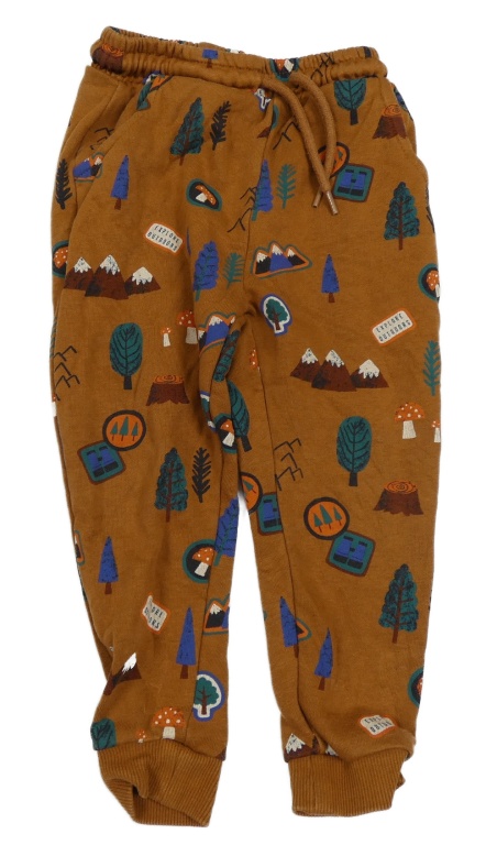 Hnedé tepláky so stromami a muchomůrkami Tu