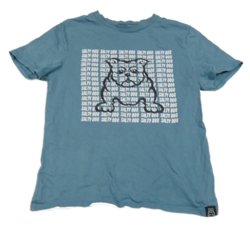Šedomodré tričko s nápismi a psem