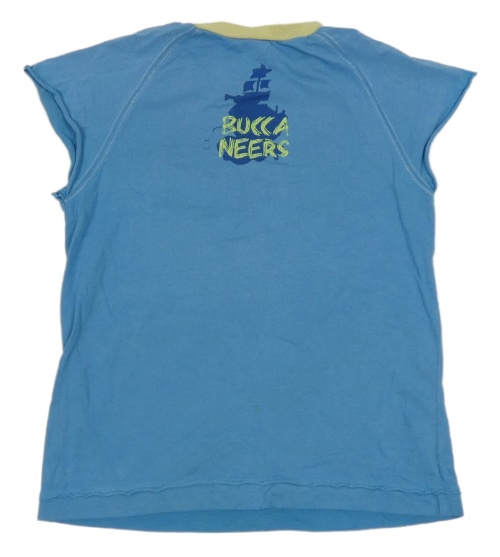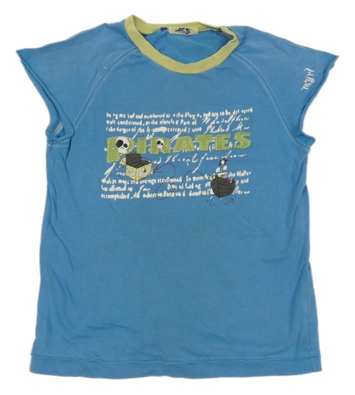 Modro-okrové melírované tričko s nápismi a pirátskou lodí a pokladem