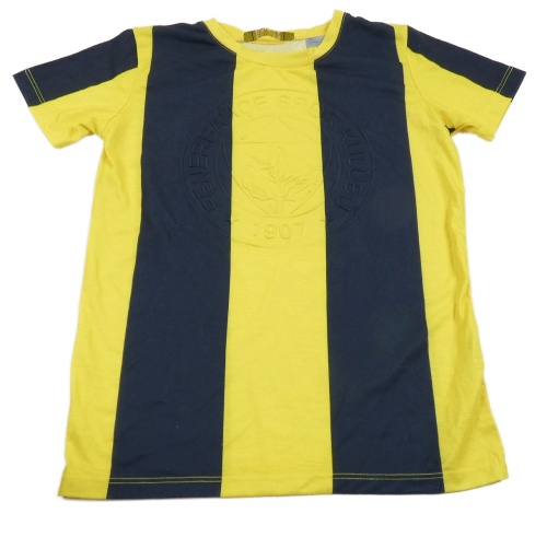 Hořčicovo-tmavomodré pruhované tričko s 3D obrázkom