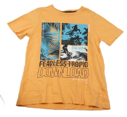 Oranžové tričko s bicyklami a listami a nápismi C&A