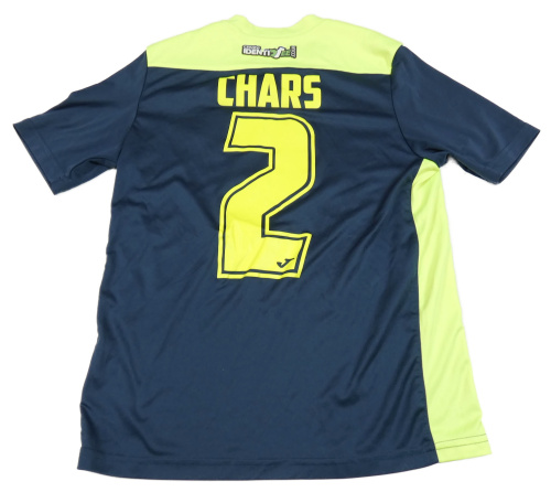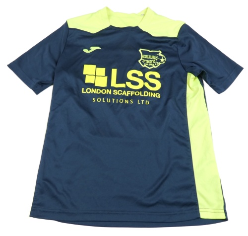 Tmavomodro-neonově zelený funkční fotbalový dres so znakom a číslom JOMA