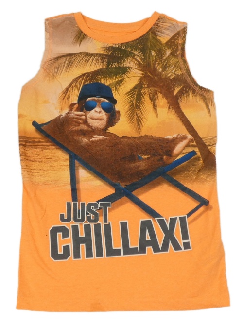 Kriklavoě oranžové melírované tielko so šimpanzom a palmou a nápismi Chapter young