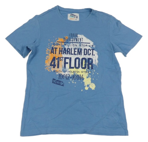 Modré tričko s nápismi a skvrnkami alive