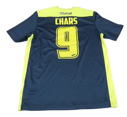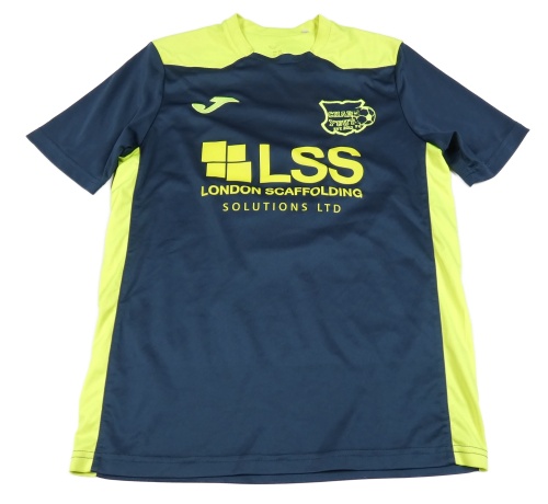 Tmavomodro-neonově zelený funkční fotbalový dres so znakom a číslom JOMA