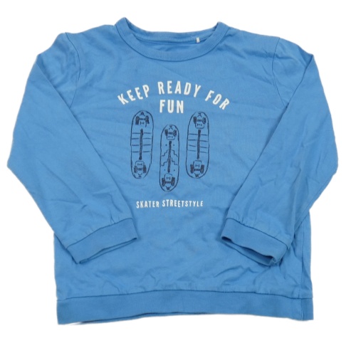Modré mikinotriko so skateboardmi a nápismi Topolino