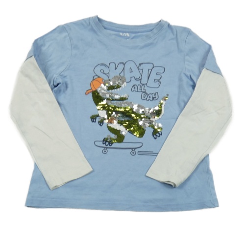 Světlemodro-biele tričko s dinosaurem z flitrů C&A