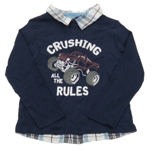 Tmavomodré tričko s monster truckem a nápismi a všitou kostkovanou košilí C&A