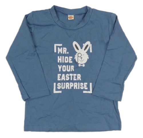 Modré tričko s nápisom a zajačikom