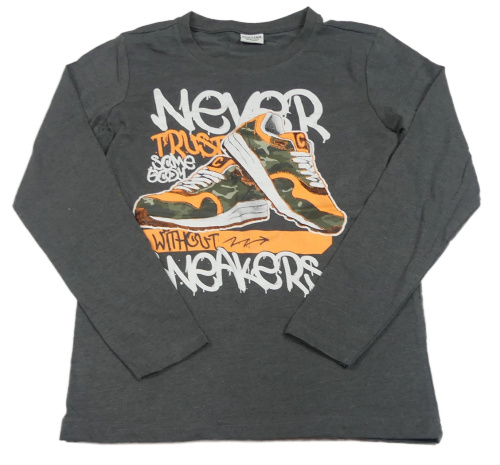 Tmavosivé melírované tričko s topánkami a nápismi Chapter young