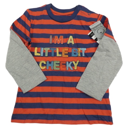 Červeno-tmavomodré pruhované tričko s nápisom a sivymi rukávy