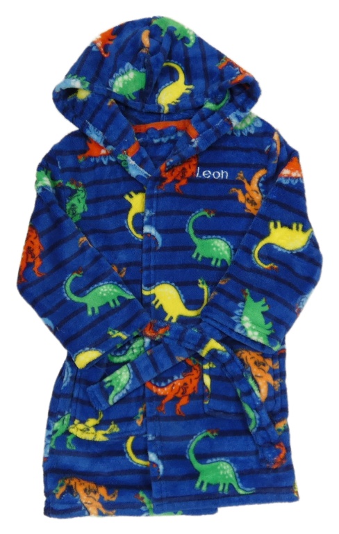 Modro-tmavomodrý pruhovaný chlpatý župan s dinosaurami a kapucňou