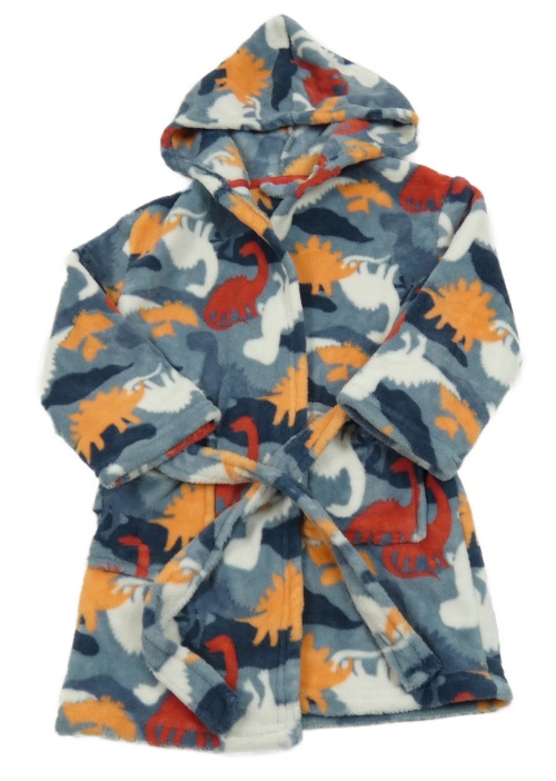 Šedomodro-bielo-oranžovo-červený plyšový župan s diny a kapucňou