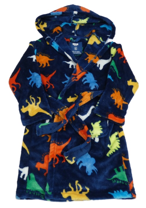Tmavomodro-farebný chlpatý župan s dinosaurami a kapucňou F&F