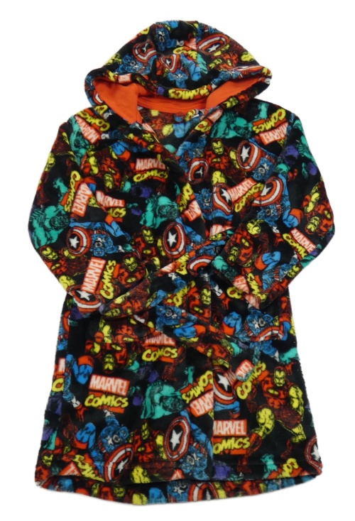 Čierno-farebný chlpatý župan s Avengers a kapucňou Marvel