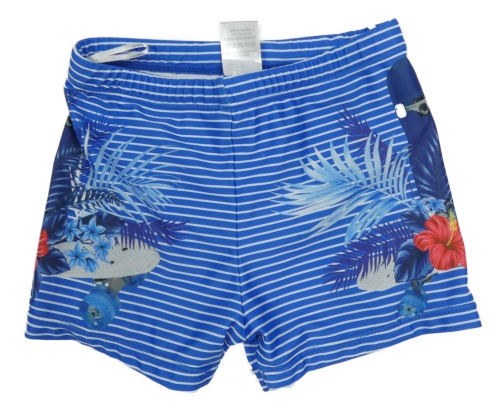 Modro-biele pruhované nohavičkové plavky s listami a skateboardmi
