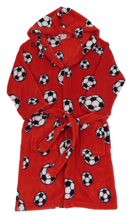 Červený chlpatý župan s loptami a kapucňou