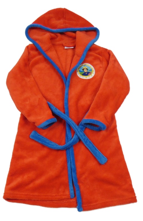 Červený chlpatý župan s Hasičem Samem a kapucňou
