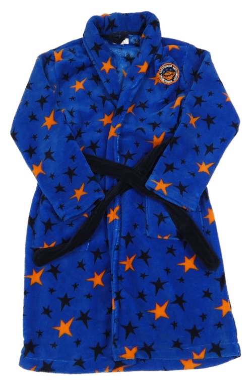 Modrý chlpatý župan s oranžovými hviezdami orchestra