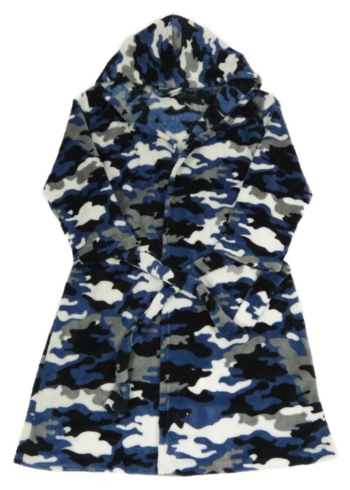 Tmavomodro-čierno-sivý army chlpatý župan s kapucňou