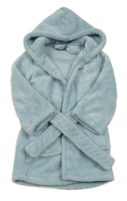 Svetlomodrý chlpatý župan s nápisom a kapucňou