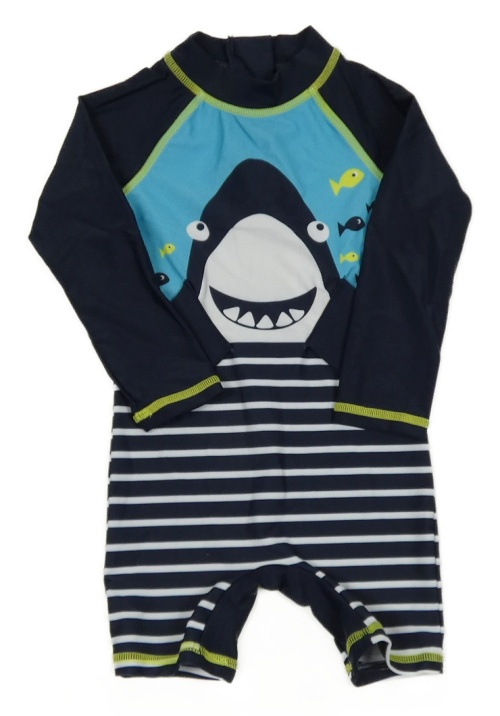 Tmavomodro-světlemodro-biely pruhovaný UV overal so žralokom Topomini