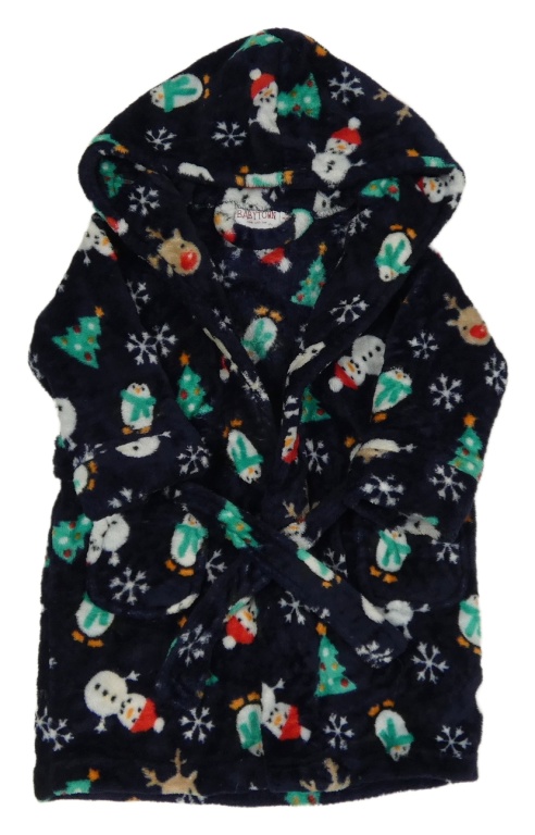 Tmavomodrý chlpatý župan s vánočním motívom a kapucňou