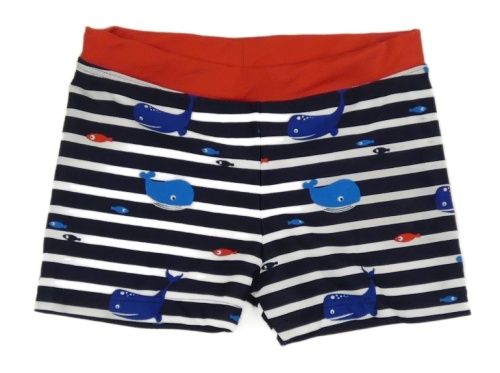 Tmavomodro-bielo-čierne pruhované nohavičkové plavky s velrybami Topomini