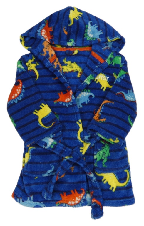 Safírovo-tmavomodrý pruhovaný plyšový župan s farebnymi dinosaurami a kapucňou