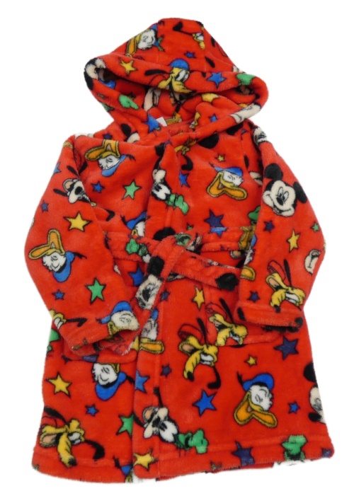 Červený chlpatý župan s Mickeym a kamarády a kapucňou