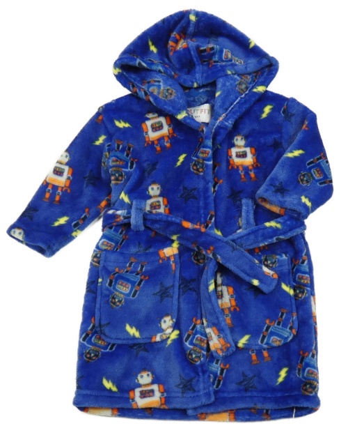 Modrý plyšový župan s robotmi a kapucňou