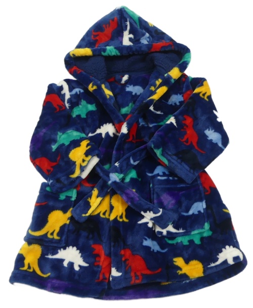 Tmavomodrý plyšový župan s farebnymi dinosaurami a kapucňou