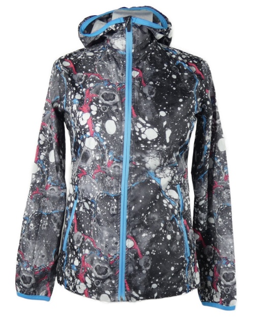 Dámska tmavošedo-modro-ružová vzorovaná šušťáková bežecká bunda s kapucňou