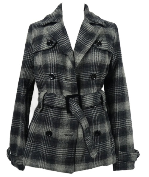 Dámsky sivo-čierny kockovaný vlnený kabát s opaskom Orsay