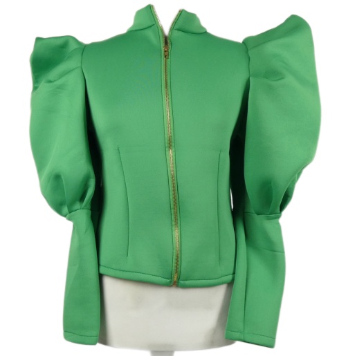 Dámský zelený neoprenový kabátek s balonovými rukávy