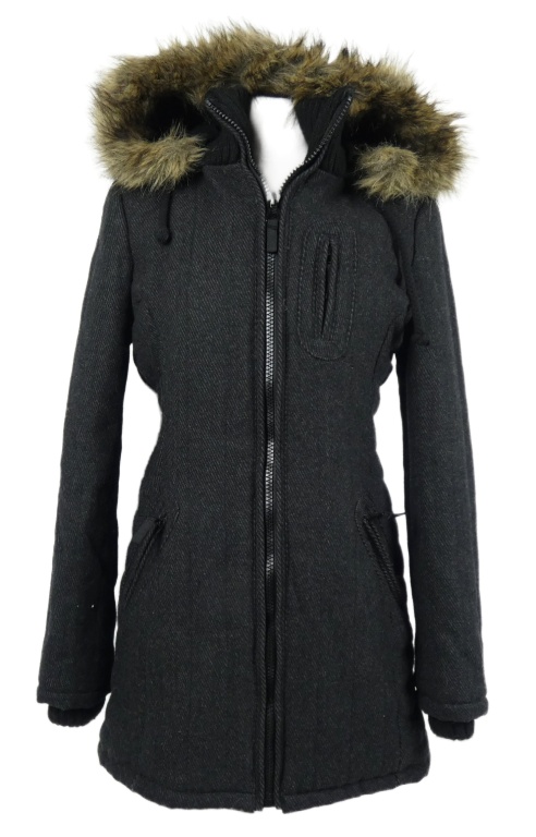 Dámsky čierny vlnený zateplený kabát s kapucňou s kožúškom Desires