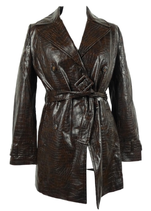 Dámsky hnedý vzorovaný koženkový kabát s opaskom MNG