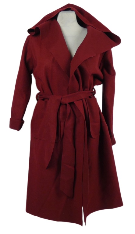 Dámsky karmínový flaušový kabát s kapucňou a opaskom