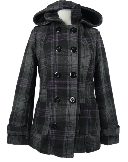 Dámsky čierno-sivo-ružový kockovaný vlnený kabát s kapucňou Fishbone