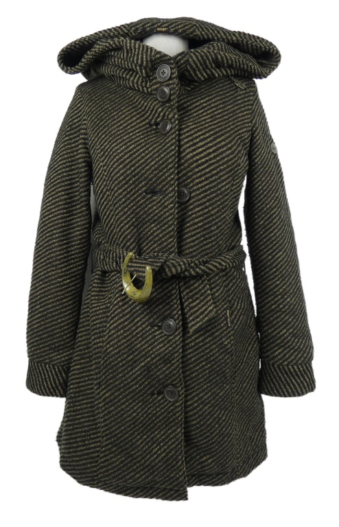 Dámsky čierno-béžový pruhovaný vlnený zateplený kabát s opaskom a kapucňou Khujo