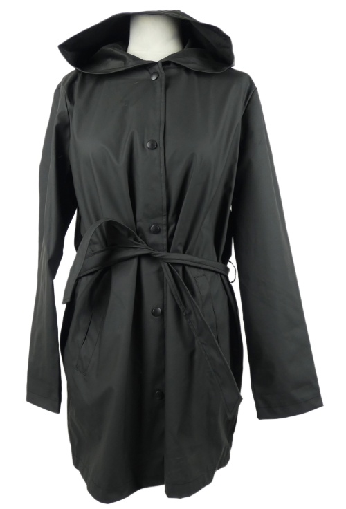Dámsky čierny pogumovaný jesenný kabát s opaskom a kapucňou JDY
