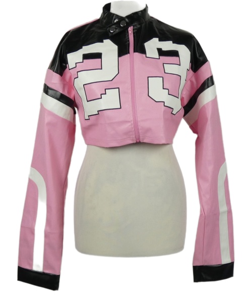 Dámska ružovo-čierna koženková crop bunda s číslom