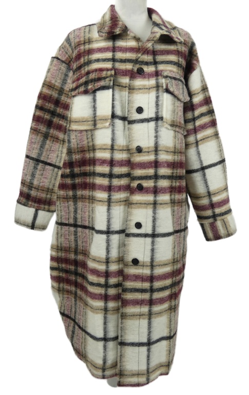 Dámsky smetanovo-vínovo-sivý kockovaný vlnený kabát