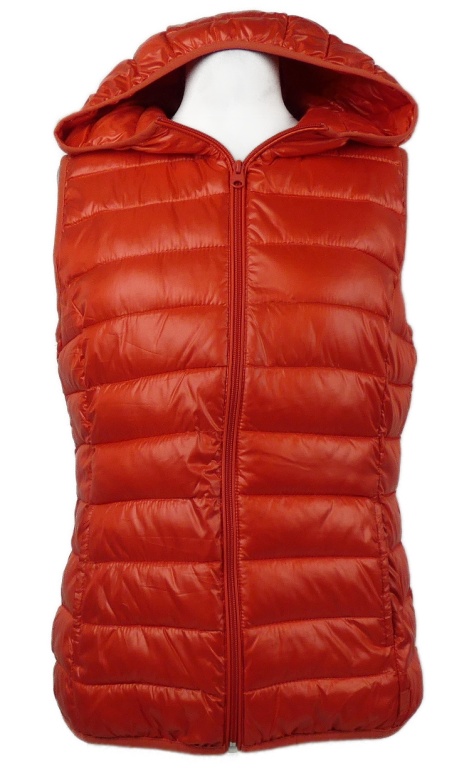 Dámska červená šušťáková prešívaná zateplená vesta s kapucňou