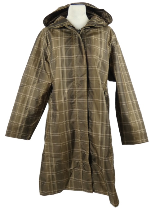Dámsky hnedý kockovaný šušťákový jesenný kabát s kapucňou