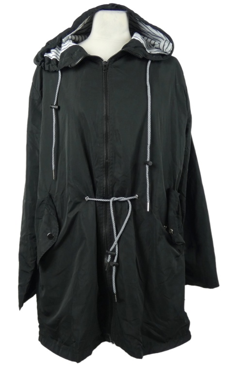 Dámsky čierny šušťákový jarný kabát so stahováním a kapucňou