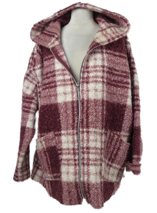 Dámska vínovo-biela kockovaná huňatá bunda s kapucňou Laura Torelli